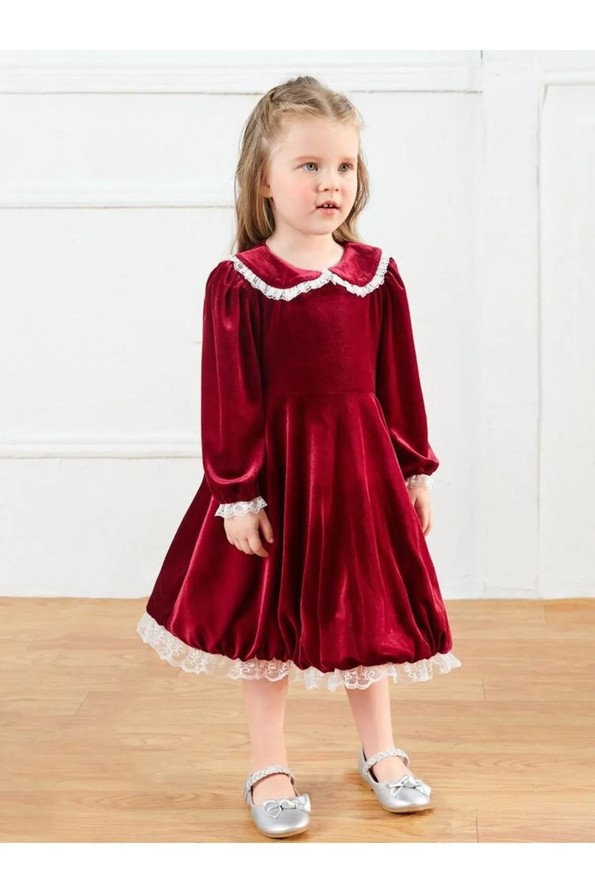 Bordo Kadife Dantel Detaylı Kız Çocuk Elbise