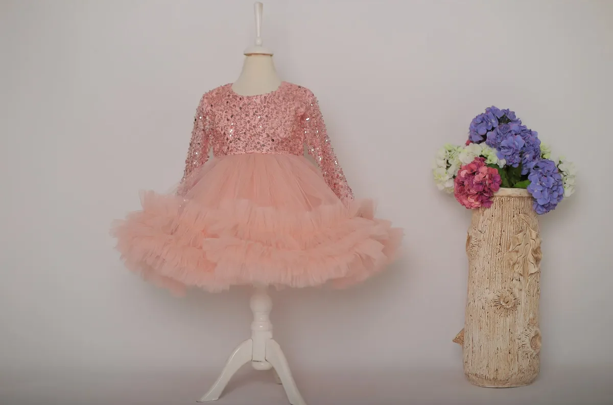 Kız Çocuk Pudra renk parti party doğum günü elbisesi