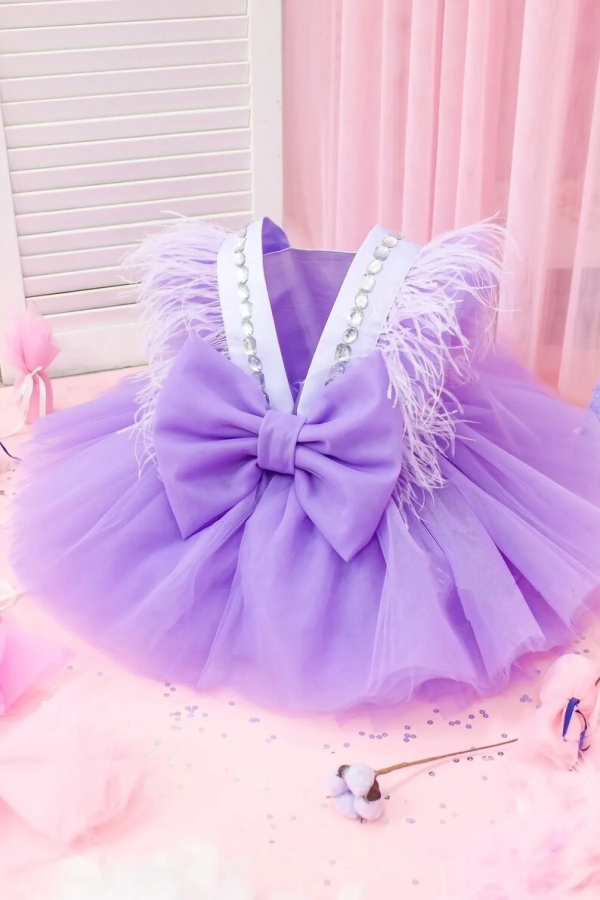 Lila Tüylü Taşlı Kız Çocuk Elbise